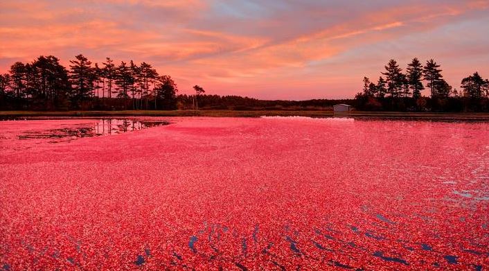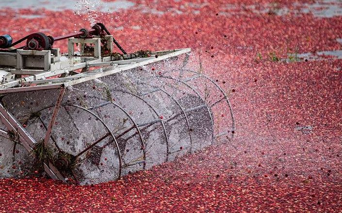 Клюкву крупноплодную собирают мокрым способом – это возможно за счет того, что в ягоде есть четыре воздушных камеры. Как это происходит? Всю плантацию заливают водой и запускают на нее трактор с мотовилом впереди. За счет гидравлического удара ягода отрывается от черешков и всплывает на поверхность воды.