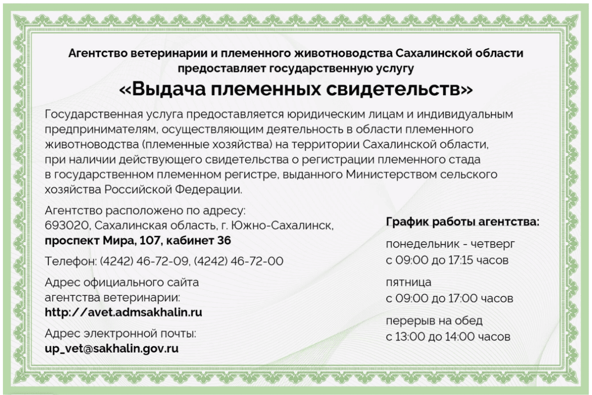 Агентство ветеринарии и племенного животноводства напоминает о порядке получения племенных свидетельств. Государственная услуга предоставляется юридическим лицам и индивидуальным предпринимателям, осуществляющим деятельность в области племенного животноводства (племенные хозяйства) на территории Сахалинской области, при наличии действующего свидетельства о регистрации племенного стада в государственном племенном регистре, выданного Министерством сельского хозяйства Российской Федерации.
