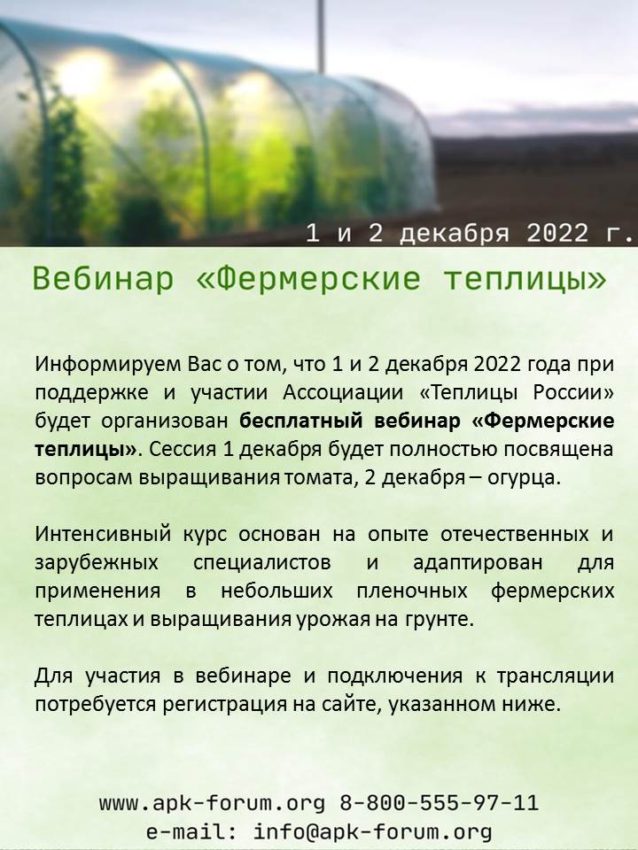 Уважаемые коллеги! Приглашаем Вас принять участие в вебинаре "Фермерские теплицы", который состоится 1 и 2 декабря 2022 года.