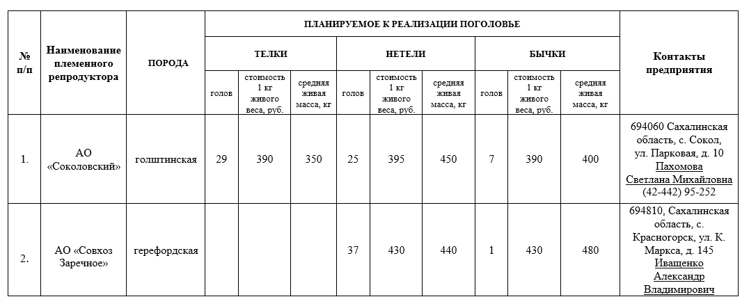 Публикуем планируемую реализацию племенного молодняка крупного рогатого скота из племенных репродукторов Сахалинской области в 2024 году, данные представлены в таблице.